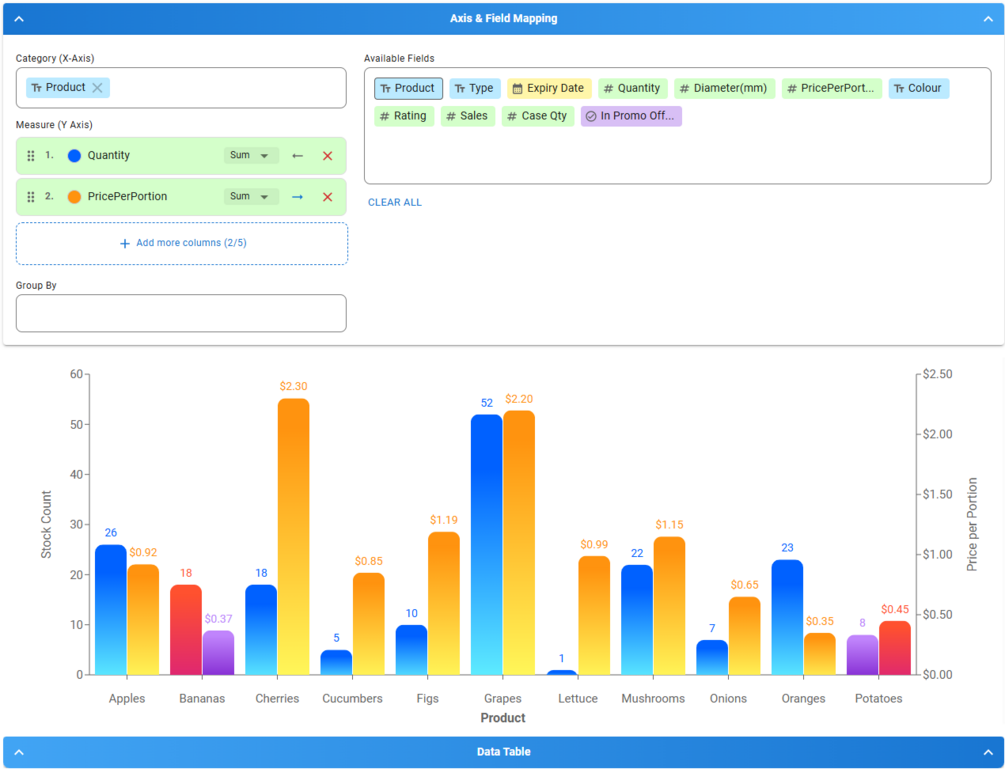 Import a CSV or paste your data directly into the app, and then map your columns to chart fields. Choose from many chart types, including Bar, Line, Area, Combo, Pie, Radar, Area-Bump, Scatter, Funnel...